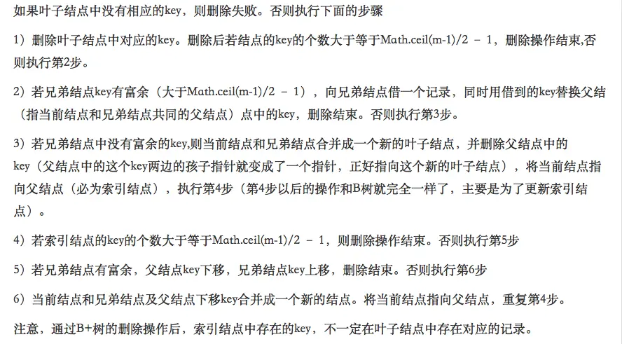 首先查找B树中需删除的元素,如果该元素在B树中存在,则将该元素在其结点中进行删除,如果删除该元素后,首先判断该元素是否有左右孩子结点,如果有,则上移孩子结点中的某相近元素(“左孩子最右边的节点”或“右孩子最左边的节点”)到父节点中,然后是移动之后的情况;如果没有,直接删除后,移动之后的情况