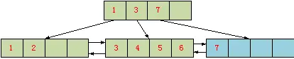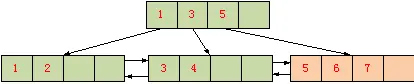 插入记录7,由于叶页面中只能存放4条记录,插入记录7,导致叶页面分裂,产生一个新的叶页面。
