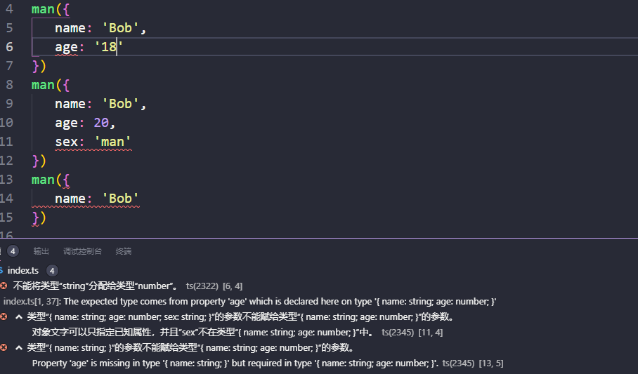 如果传入的值不符合{name: string, age: number}这种结构且类型也不正确,就会报错。