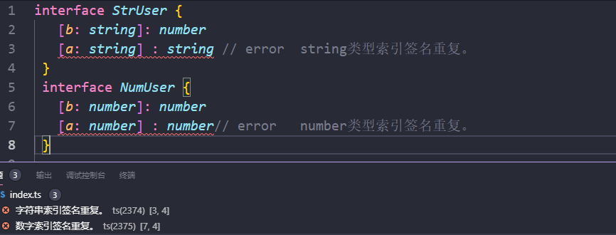 需要注意的是,尽管TS支持继承接口,但是如果继承的接口中,定义了同名属性但类型不同的话,是不能编译通过的