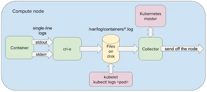 这样的旅程始于 OKD,因为该容器平台完全覆盖了它抽象的硬件。这意味着日志消息等待由驻留在容器中的应用程序写入 stdout 或 stderr 流。从那里,日志消息被容器引擎(例如 CRI-O)重定向到节点的文件系统。