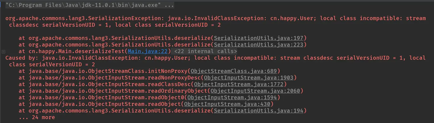 org.apache.commons.lang3.SerializationException: java.io.InvalidClassException: cn.happy.User; local class incompatible: stream classdesc serialVersionUID = 1, local class serialVersionUID = 2