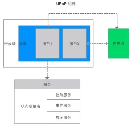 - 控制点。即控制设备,可发现并控制其他设备。如控制其他设备的视频播放、暂停等。