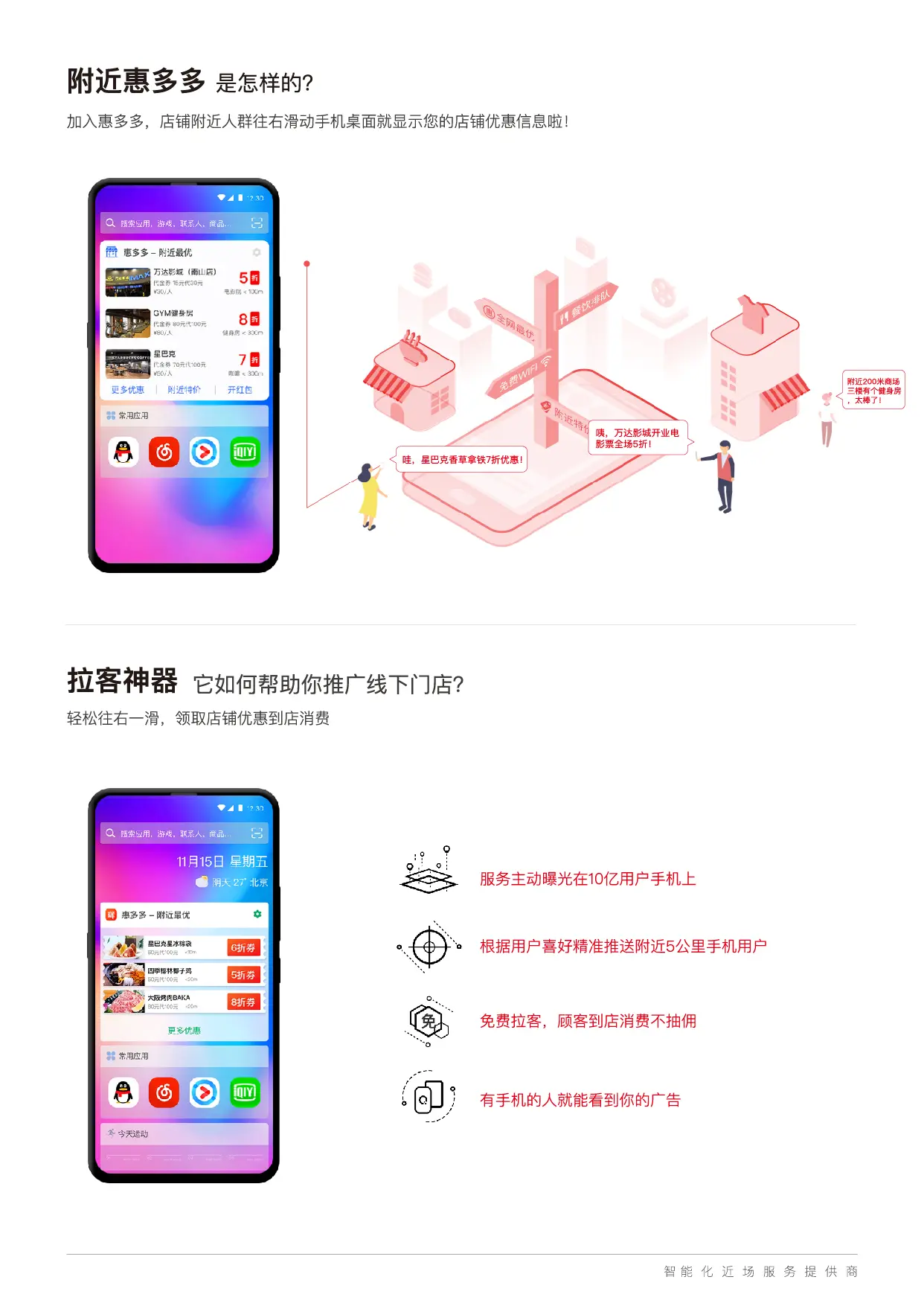 用户在接近服务场景或是进入服务场景后,快应用以服务卡片的形式,将店铺信息、优惠活动、便民信息等通过手机负一屏、通知栏、息屏等系统级入口,主动智能分发到用户手机上。