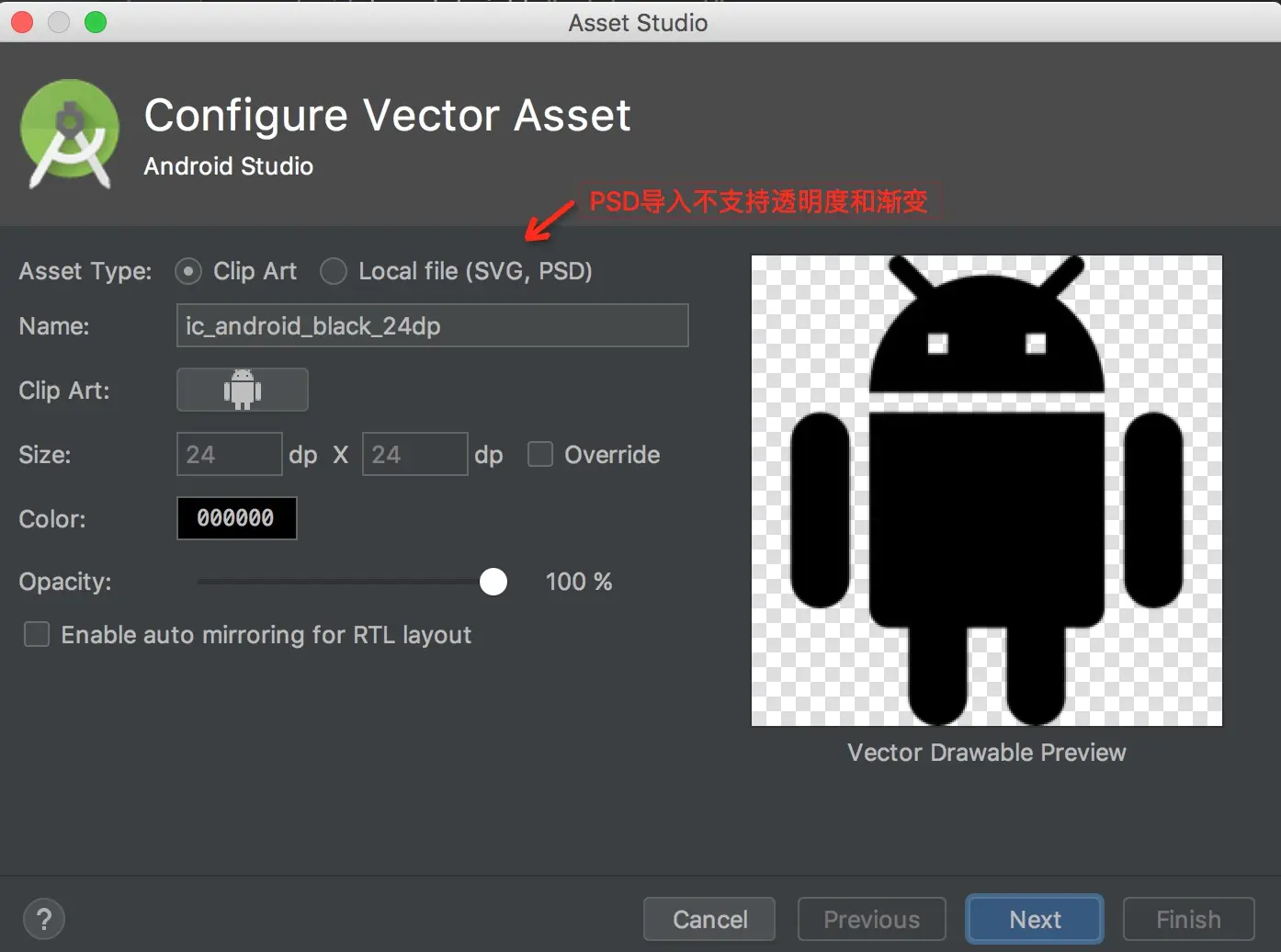 对于 Android 5.0(API 级别 21)及更高版本,Vector Asset Studio 支持所有 VectorDrawable 元素。为向后兼容 Android 4.4(API 级别 20)及更低版本,Vector Asset Studio 支持部分 XML 元素。