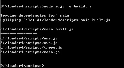 然后执行node r.js -o build.js打包命令,生成的文件就可以用了。并且发现r.js有个非常智能的地方,如果把main.js中的require语句的依赖项中的jquery去掉,再执行打包,它会将jquery源码从main-built.js中去掉。