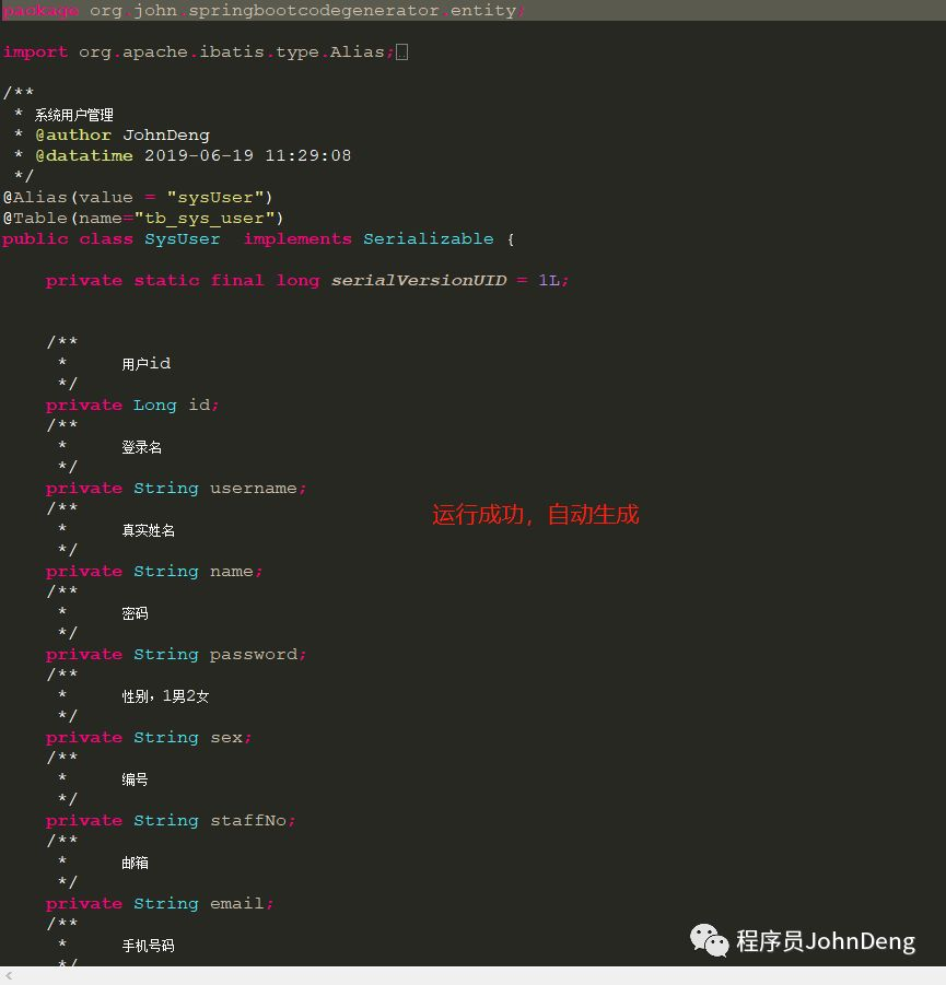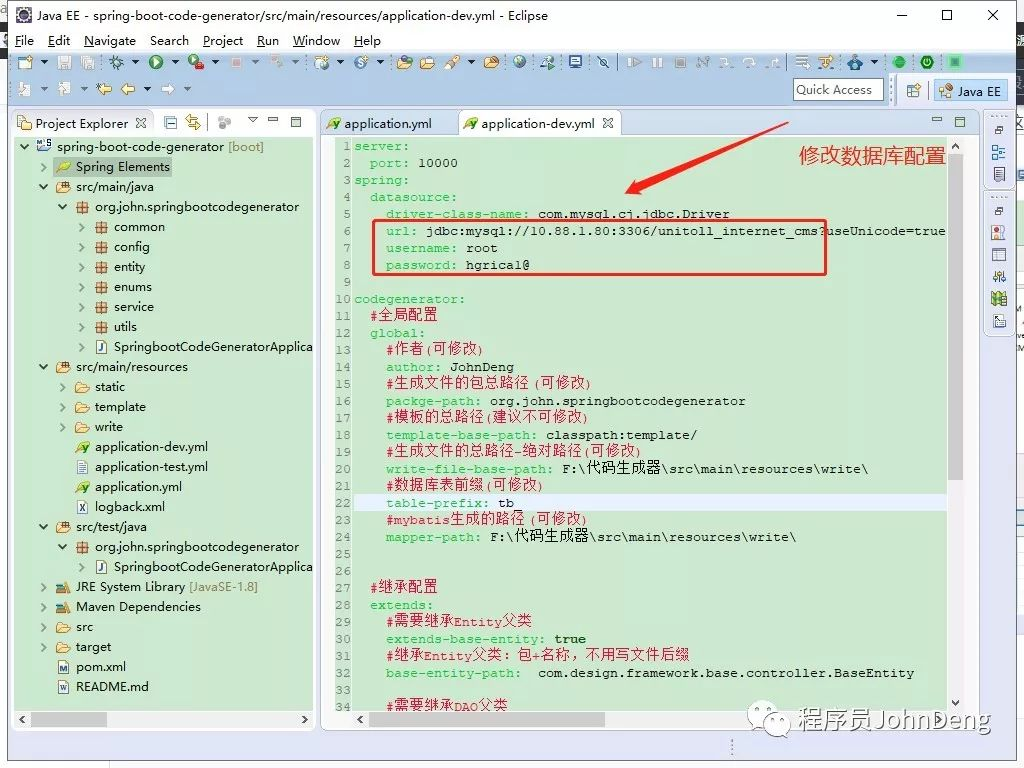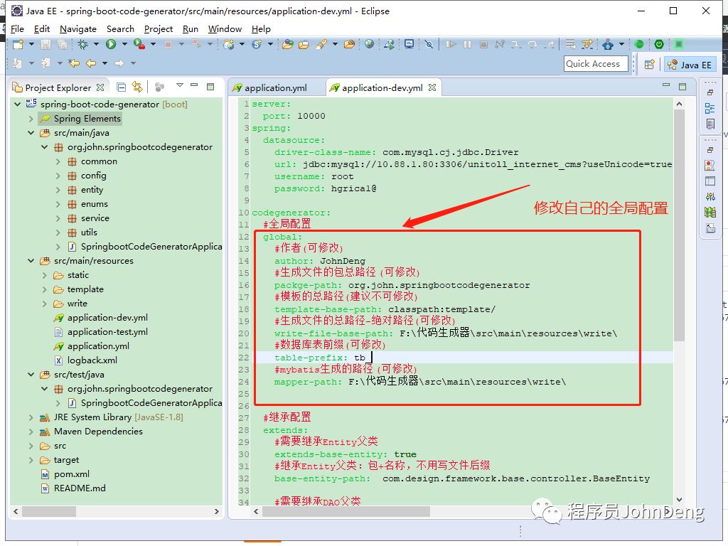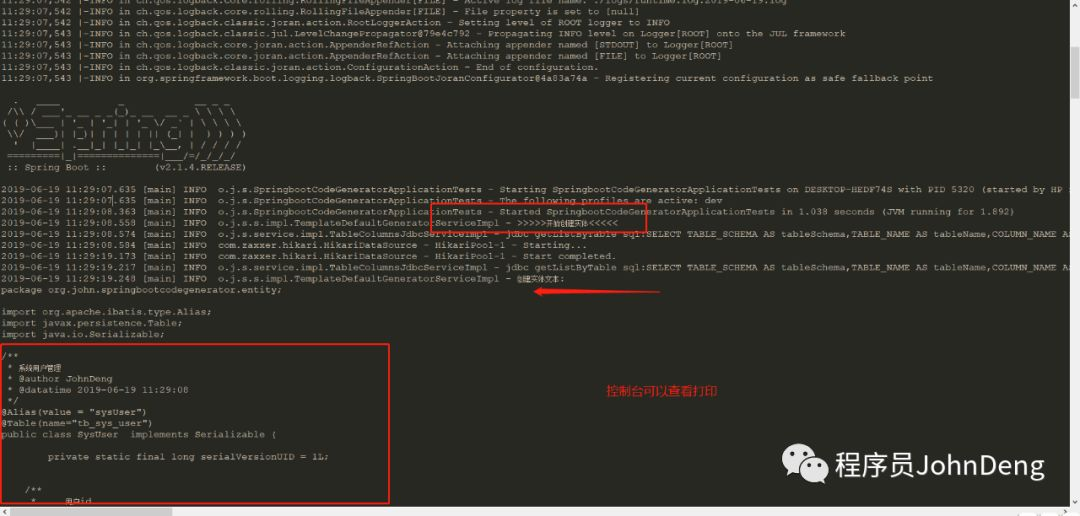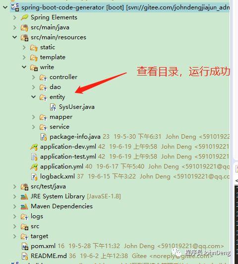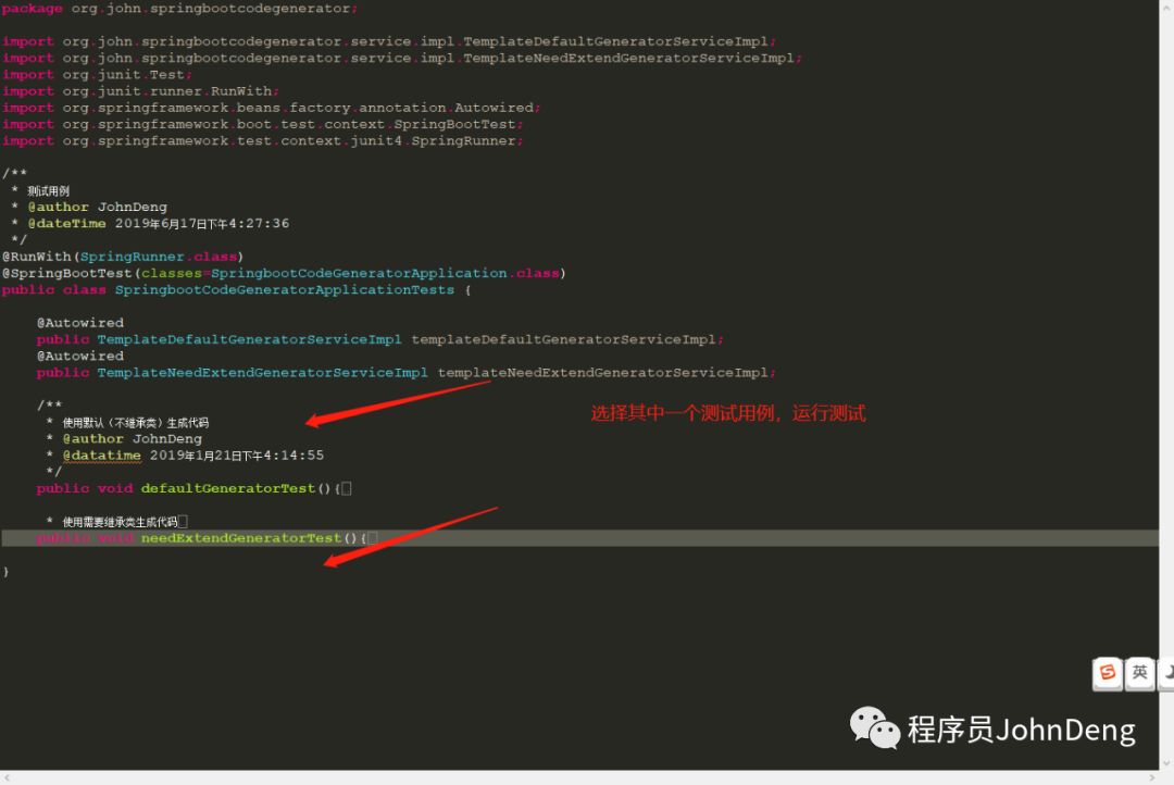5.打开src\test\java\org\john\springbootcodegenerator的SpringbootCodeGeneratorApplicationTests.java,运行测试用例