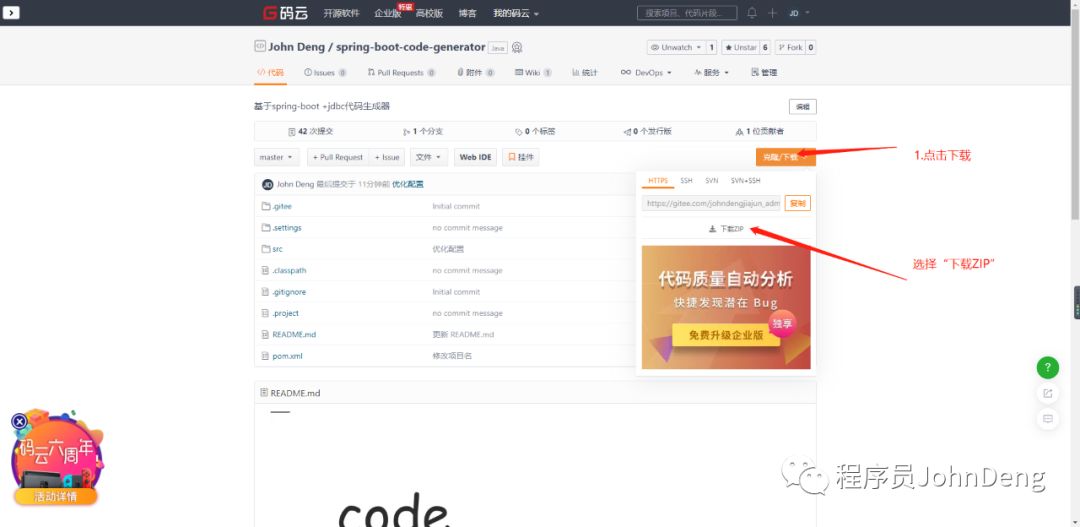 项目地址:https://gitee.com/johndengjiajun_admin/springboot-code-generator