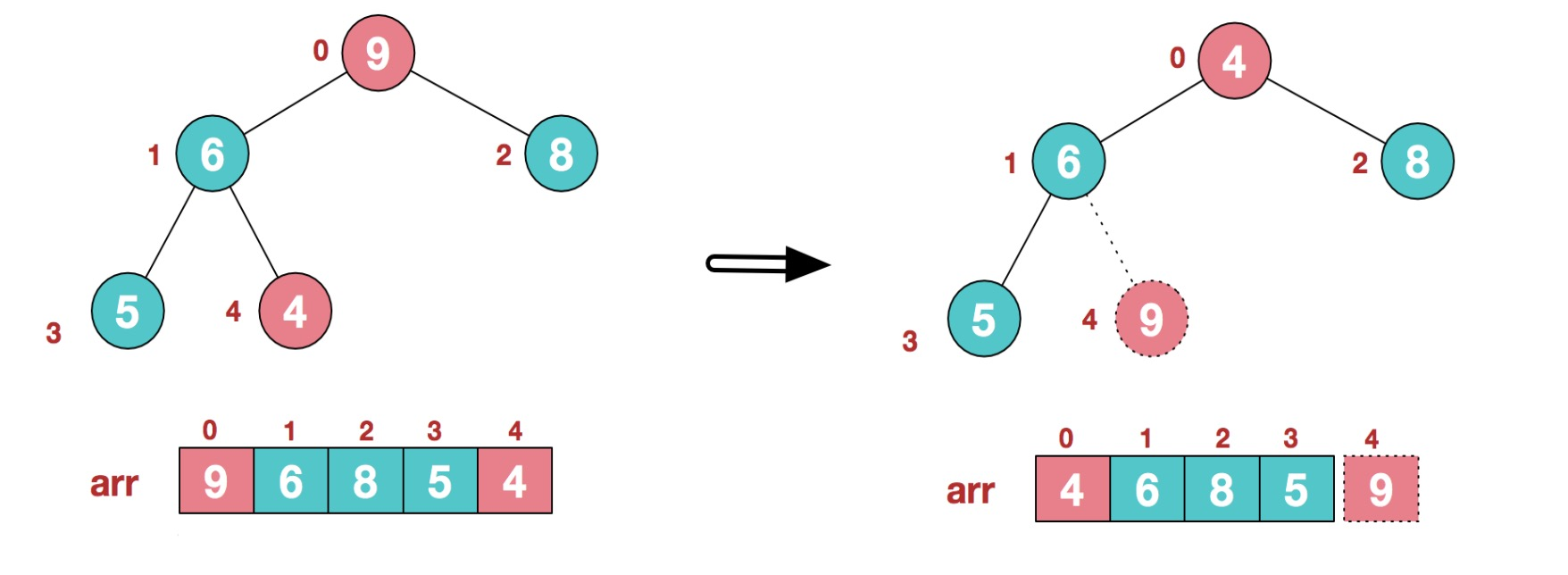 3.继续找非叶节点,9,4,8中9最大,所以和根元素交换位置