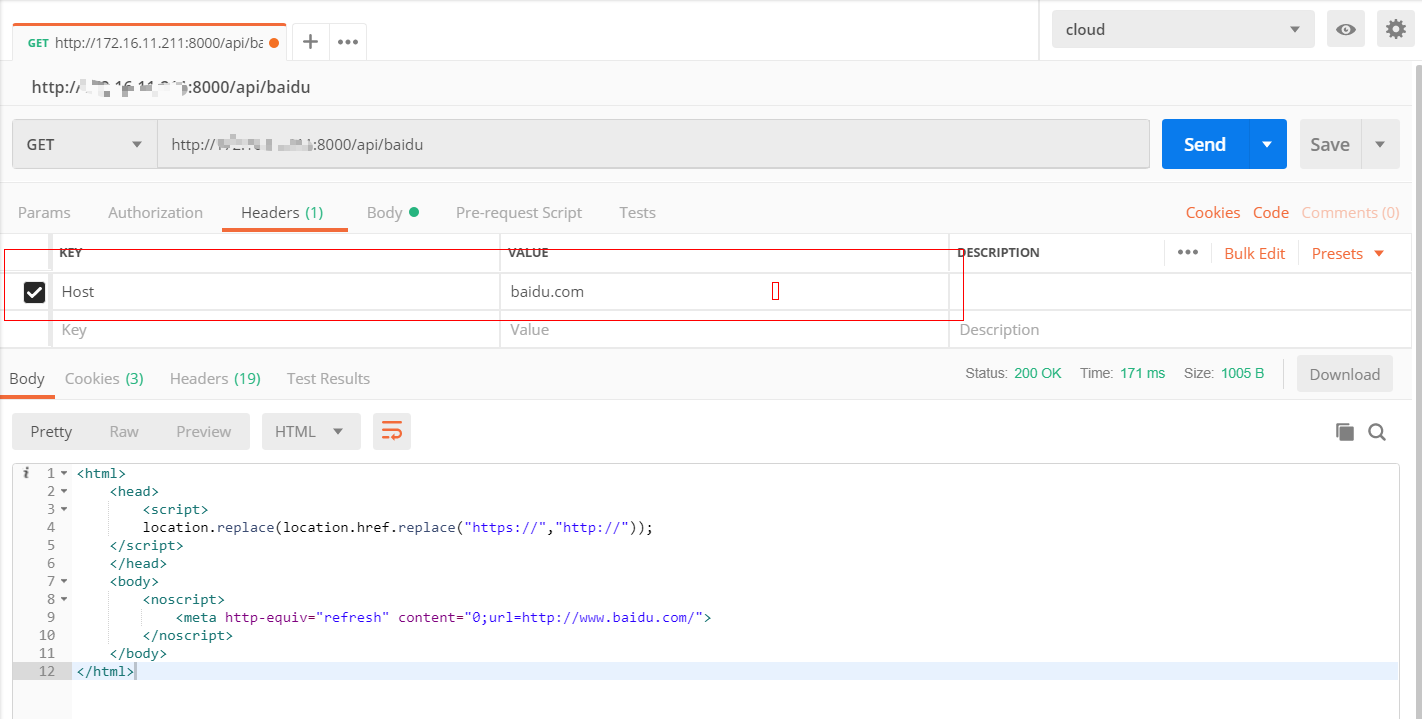 注意,如果Api暴露的地址与前面Host定义的地址(baidu.com)不一致,就需要在请求的Headers里面加入参数Host=baidu.com