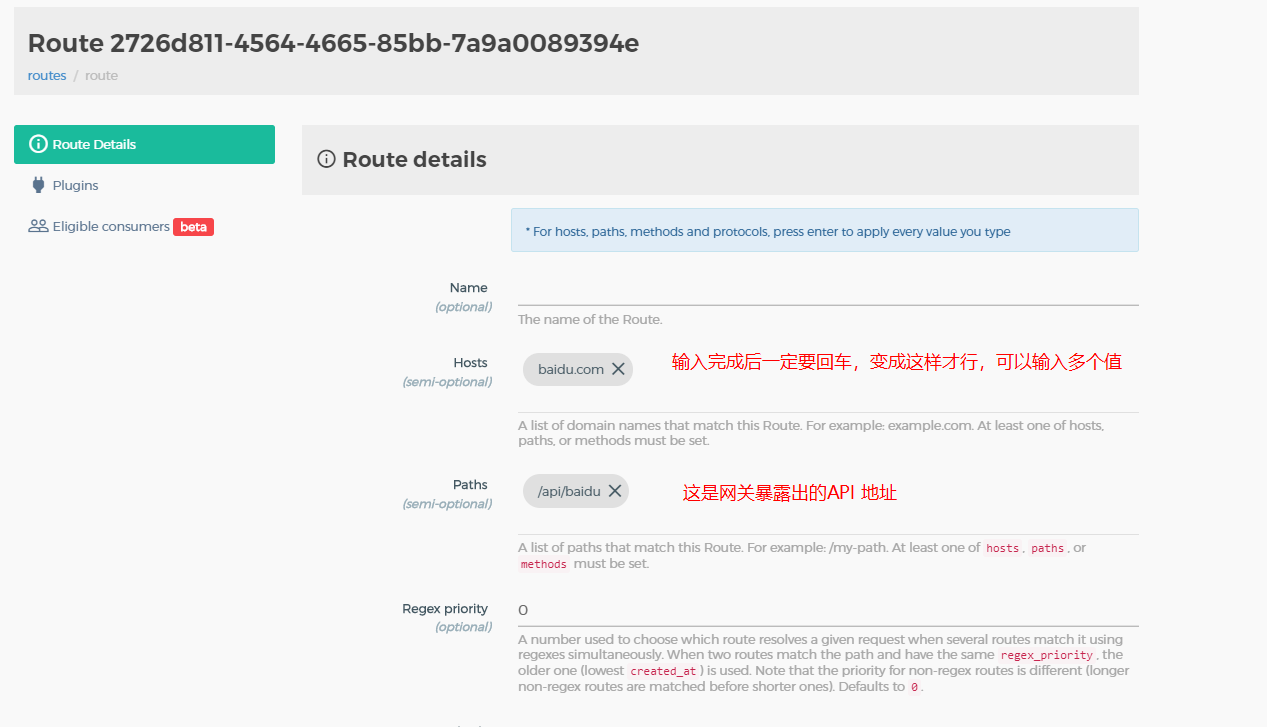 路由:路由是进入Kong的入口点,并为要匹配的请求定义规则,并路由到给定的Service。服务和路由之间的关系是一对多的关系。