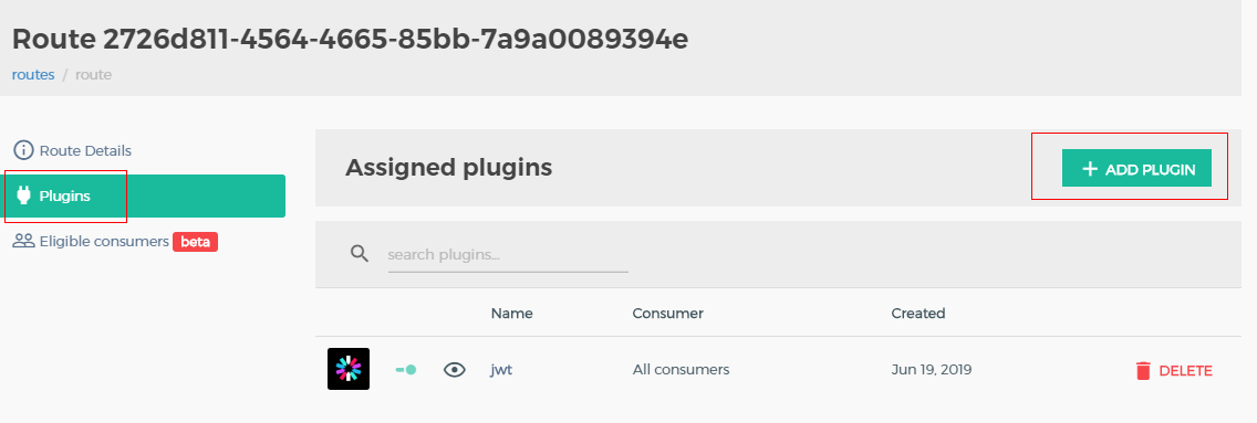 上面的配置,只要知道Router的地址,就可以访问获取数据,我们要把API加入身份认证。如果API面对不是具体用户,而是其他的系统,可以使用JWT来进行系统间身份认证,使用Kong JWT插件就可能完成这功能。JWT 插件要在对应的Router上进行启用。
