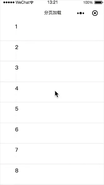 上面的代码就是我们实现分页加载的所有逻辑代码。简单说下代码 1,我们首先进页面时会请求前10条内容 2,10条内容请求成功以后,我们会把请求到的内容加入dataList数组,然后把dataList里的数据显示到页面上。并将currentPage加一,用于请求第二页数据。 3,当用户滑动到底部时,会触发onReachBottom事件,在这个事件里做第二页到请求。然后第二页数据请求成功以后。继续将currentPage加1,这里要记住一定,一定要请求成功以后才将currentPage +1。