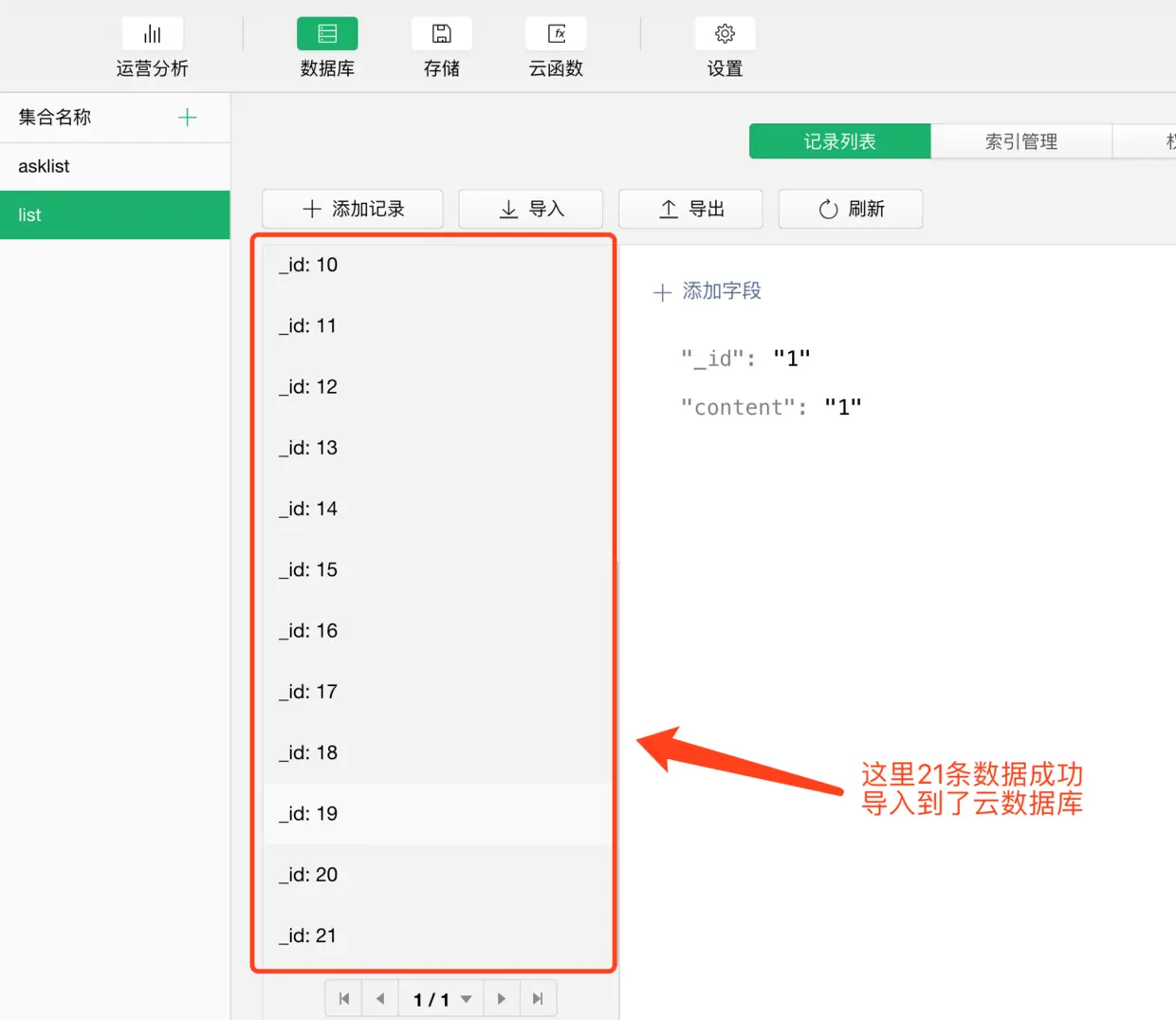 然后把数据导入到我们的云开发的数据库里,关于数据如何导入,这里不再讲解,不知道的同学,请看下面这篇文章。或者去老师历史文章里找一下。 《小程序云开发入门---云数据库数据源的导入与导出》