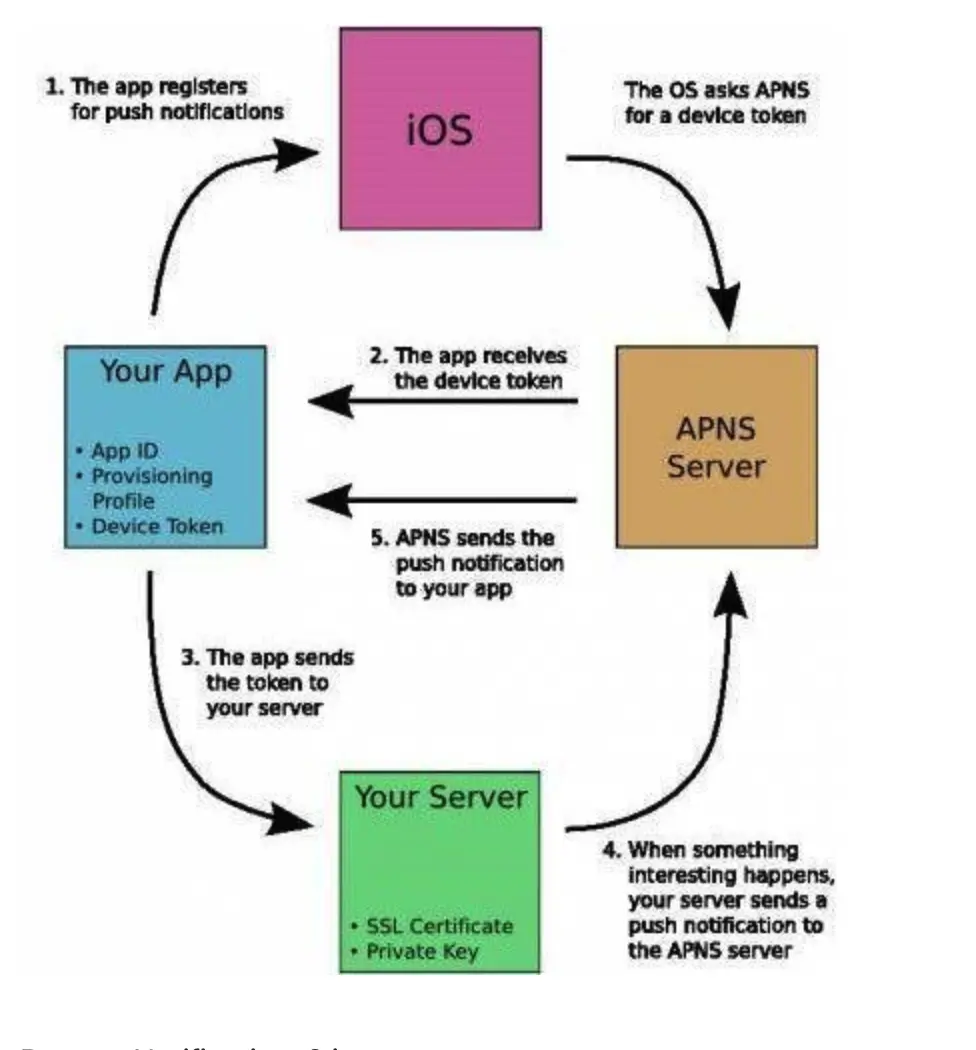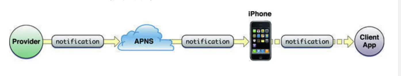 Probider是你的服务器 APNs是苹果推送的服务器 Apple Notifiction Service iPhone 是你的手机终端 Client App 是你的应用程序