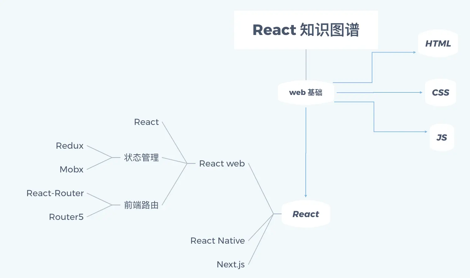 我们以下面的 React 知识图谱做一个 demo,作为开发此面包屑导航组件的环境。图上的每个节点就是一个页面。