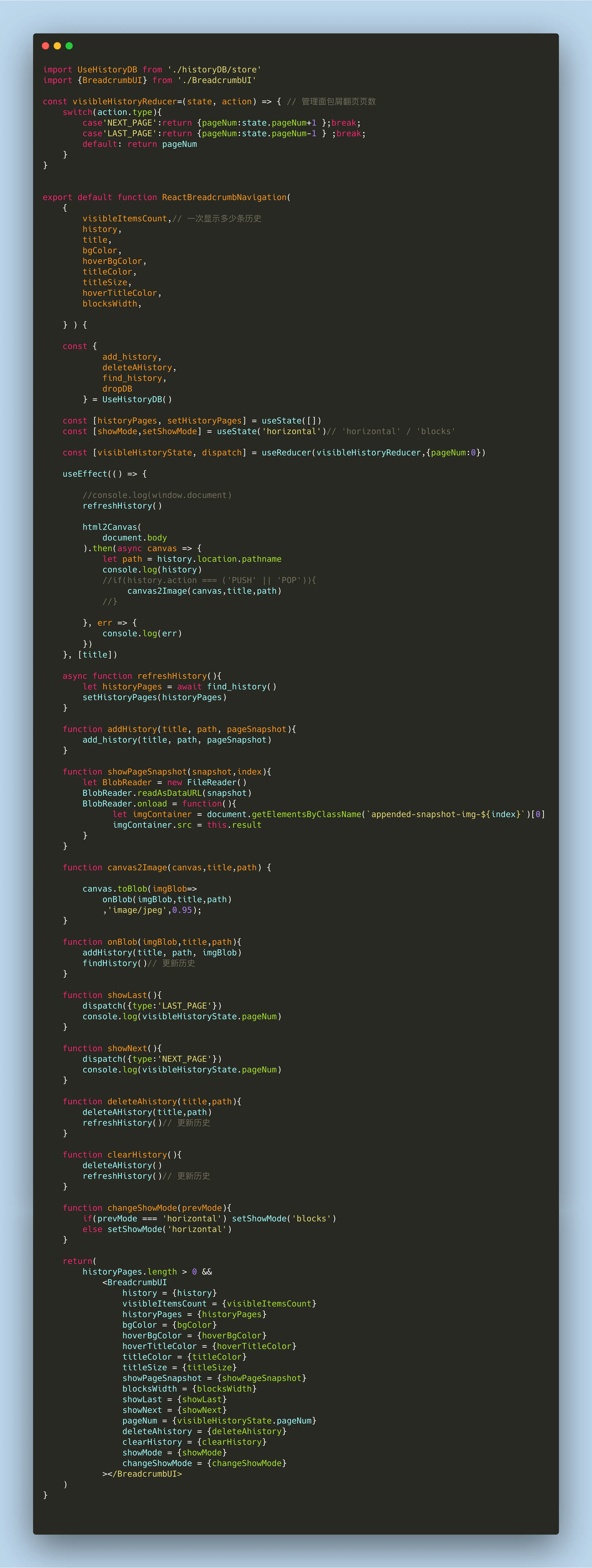 src/index.js是组件的入口文件,它调用数据库定义的方法,实现进入新页面时自动添加当前会话历史,删除历史中任意一个节点等功能,在进入新页面时会调用html2canvas为当前页面生成快照,同时调用history获取页面的 path ,和 用户自定义的 title 一起存入数据库,这样就添加了一个会话历史。另外,面包屑组件使用分页,每次只显示少量的导航标题(显示数目留给组件使用者定义),因此用 useReducer 实现一个分页器功能。