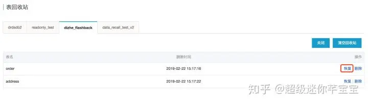DRDS 表回收站针对误删表操作,提供快速的数据恢复能力。表回收站功能开启后,通过 DROP TABLE 指令删除的表,将移动至表回收站中,2 小时内皆可从回收站中快速恢复。