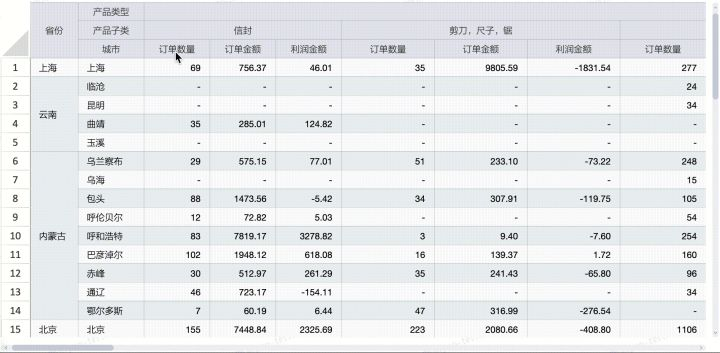 即行上拖入正常的 “省份” “城市” 两个维度,而列上也拖入两个 “产品类型” “产品子类” 维度,并且保留正常的三个度量 “订单数量/订单金额/利润金额”(原理是:拖入列中的维度,将以其“维度值”作为分类指标来进行数据归类)