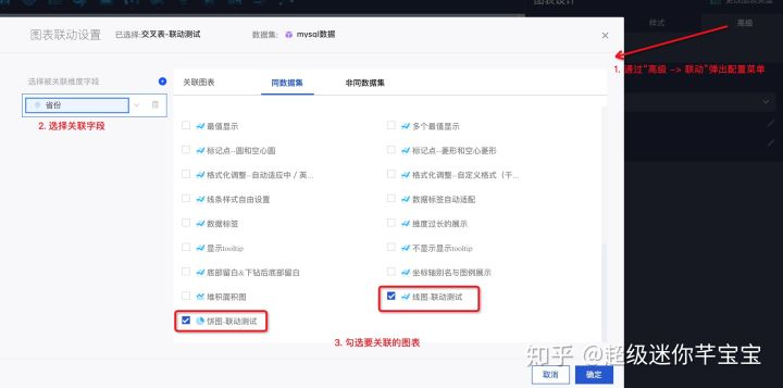 如果我们想在交叉表中点击某个省(如“上海”)时,立即让下方的线图和饼图也相应展示“上海”的数据,就可以通过联动来实现了,配置的方式很简单,只需要你指定 该交叉表 与 哪些图表 联动即可(通过字段绑定建立联系):