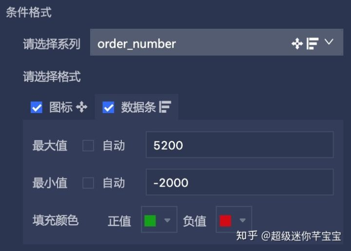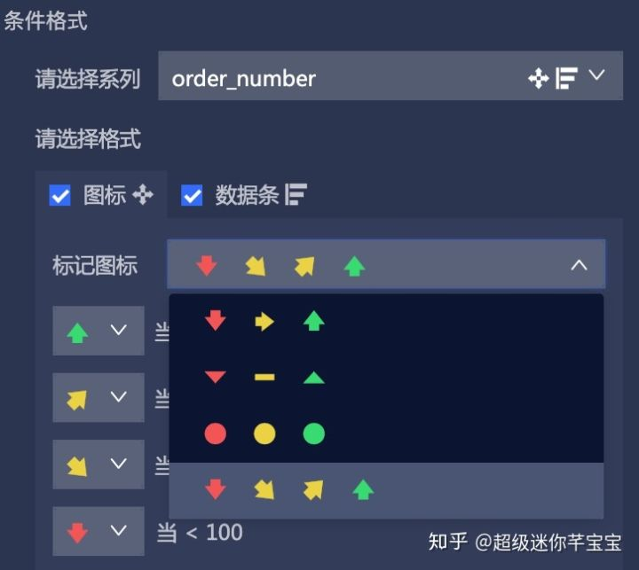 熟悉excel操作的同学应该对条件格式不陌生了,有了条件格式,可以方便决策者识别出关键信息点,并且了解到不同阀值的数据指标,当前我们提供了 阶段图标 和 数据条 类型的条件格式,配置方式和常规一致: