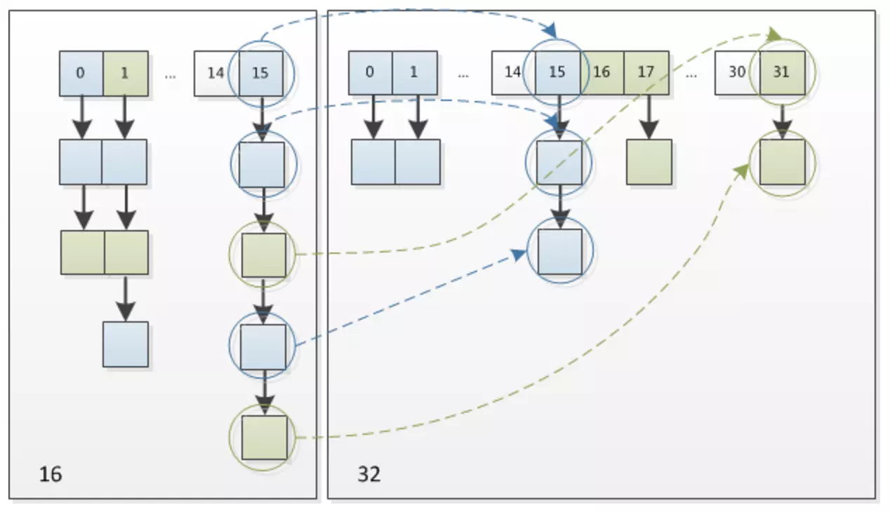 当put时,如果发现目前的bucket占用程度已经超过了Load Factor所希望的比例,那么就会发生resize。在resize的过程,简单的说就是把bucket扩充为2倍,之后重新计算index,把节点再放到新的bucket中。当超过限制的时候会resize,然而又因为我们使用的是2次幂的扩展(指长度扩为原来2倍),所以,元素的位置要么是在原位置,要么是在原位置再移动2次幂的位置。