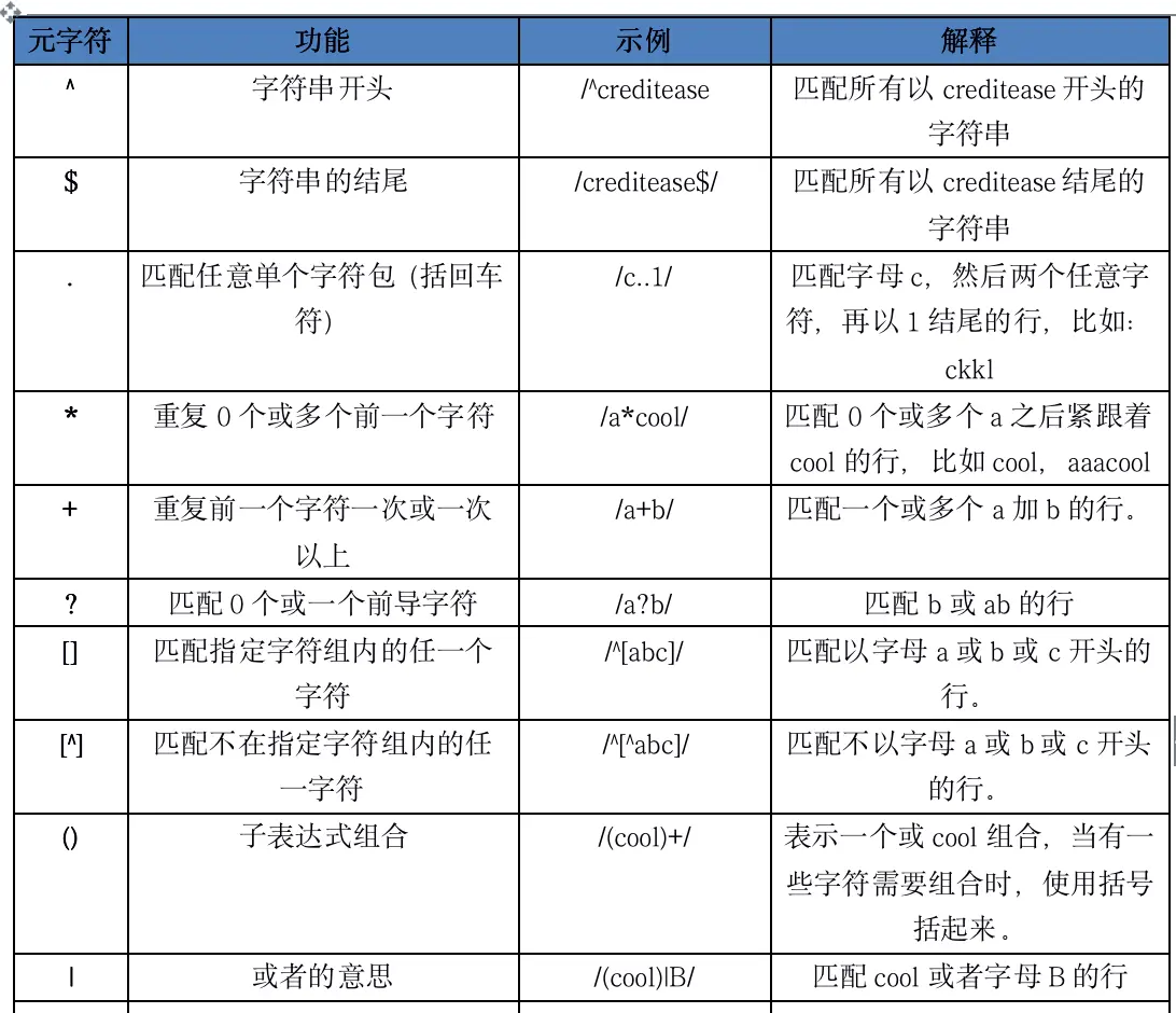 awk同sed一样也可以通过模式匹配来对输入的文本进行匹配处理。 awk也支持大量的正则表达式模式,大部分与sed支持的元字符类似,而且正则表达式是玩转三剑客的必备工具。