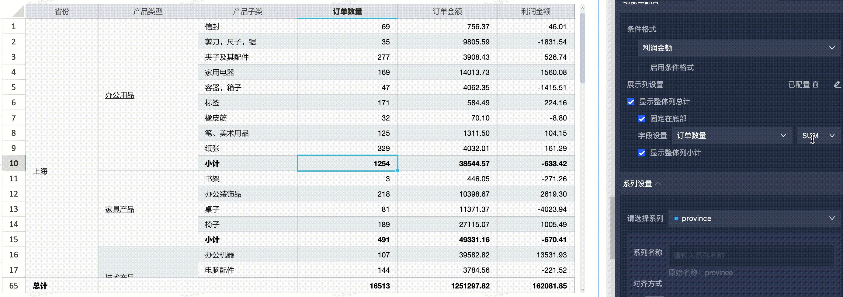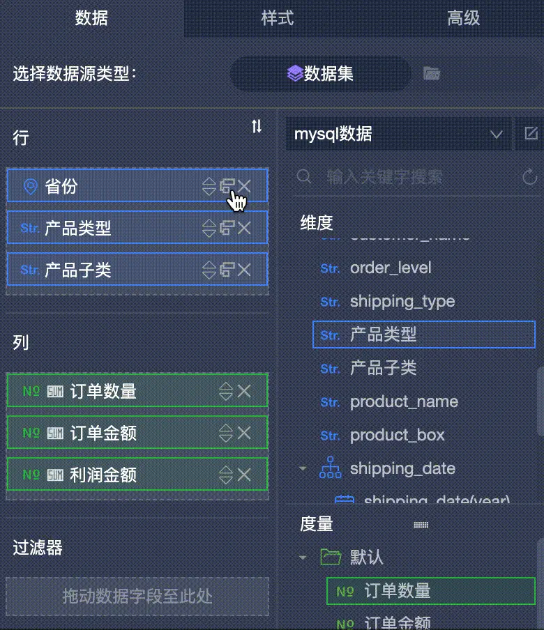 比方说:我们想要在行上凸显出“省份 -> 城市”的层级关系,并且还要在列上凸显出“产品类型 -> 产品子类 -> 订单数量/订单金额/利润金额”这样的层级关系,最终对应起来看一个对比数据。那么我们可以进行以下配置: