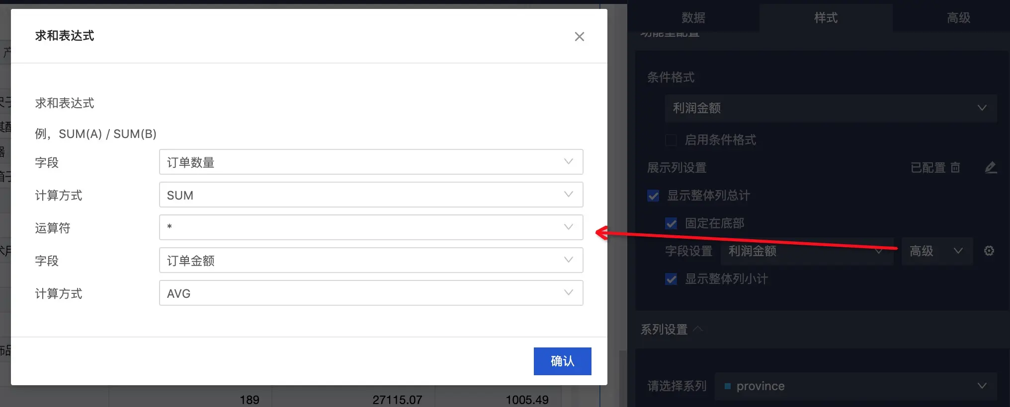 高级聚合相对于常规来讲,支持用多个其他字段的汇总结果,通过四则运算得到目标字段的汇总结果。比如我们可以实现:利润金额的汇总结果 = AVG(订单金额) * SUM(订单数量) 的效果: