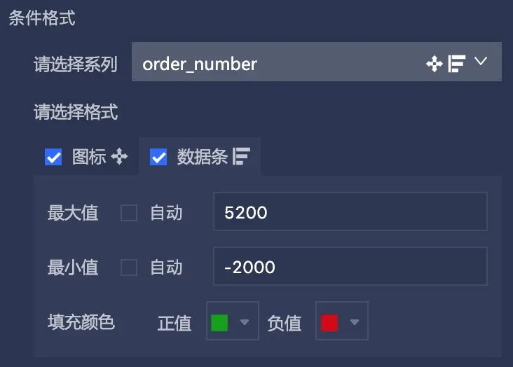 熟悉excel操作的同学应该对条件格式不陌生了,有了条件格式,可以方便决策者识别出关键信息点,并且了解到不同阀值的数据指标,当前我们提供了 阶段图标 和 数据条 类型的条件格式,配置方式和常规一致: