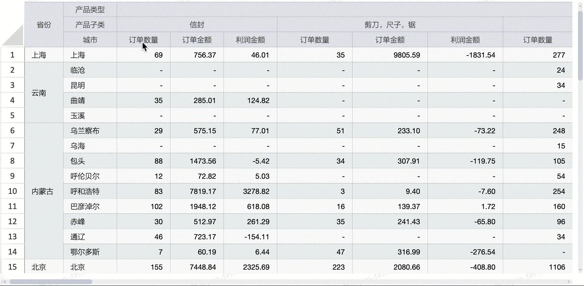 即行上拖入正常的 “省份” “城市” 两个维度,而列上也拖入两个 “产品类型” “产品子类” 维度,并且保留正常的三个度量 “订单数量/订单金额/利润金额”(原理是:拖入列中的维度,将以其“维度值”作为分类指标来进行数据归类)