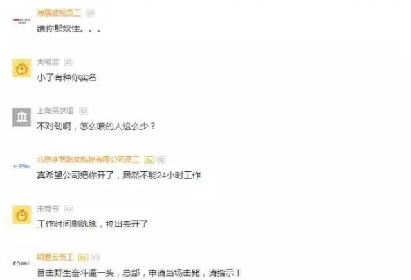 有网友就讽刺到。瞧你那奴性。真希望公司把你开了,居然不能24小时工作,目击野生奋斗逼一头,总部,申请当场击毙,请指示!对啊,所以说应该把你这种不24小时不间断工作的人开了,公司是属于我们这些直接住里边的人的