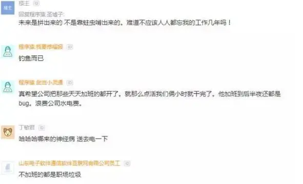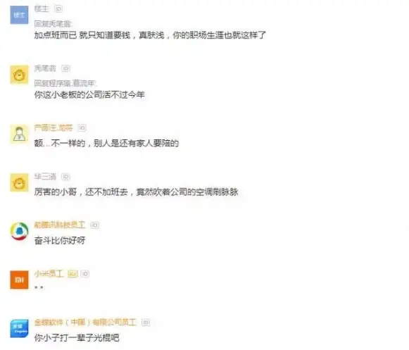 在互联网职场论坛,一个程序员发帖吐槽到。真希望公司把不加班的都开了,见不惯这些上个班还偷懒的人。在公司,有工伤保险,还有空调,有加班补助,那么早回去干嘛?还影响整个团队氛围!不努力的人必须要被淘汰!加点班而已,就只知道要钱,真肤浅,职场生涯也就这样了,没有事业 拿什么来维持生活品质?未来是拼出来的,不是靠蛀虫啃出来的。难道不应该人人都忘我的工作几年吗!为什么一定要偷懒!好好奋斗真的就有这么难!如果所有人都这样,天啊,社会还怎么发展!这样的吐槽也是瞬间引起了网友的围观与议论,我们再来看看网友都怎么说。