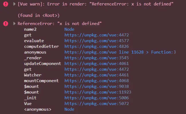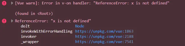 这个错误在控制台也[Vue warn]和常规报错。和上一个错误的区别在于,只有你点击了按钮才会触发函数调用,才会报错。