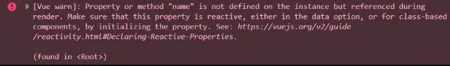 Warn: Property or method 'name' is not defined on the instance but referenced during render. Make sure that this property is reactive, either in the data option, or for class-based components, by initializing the property. See: https://vuejs.org/v2/guide/reactivity.html#Declaring-Reactive-Properties.