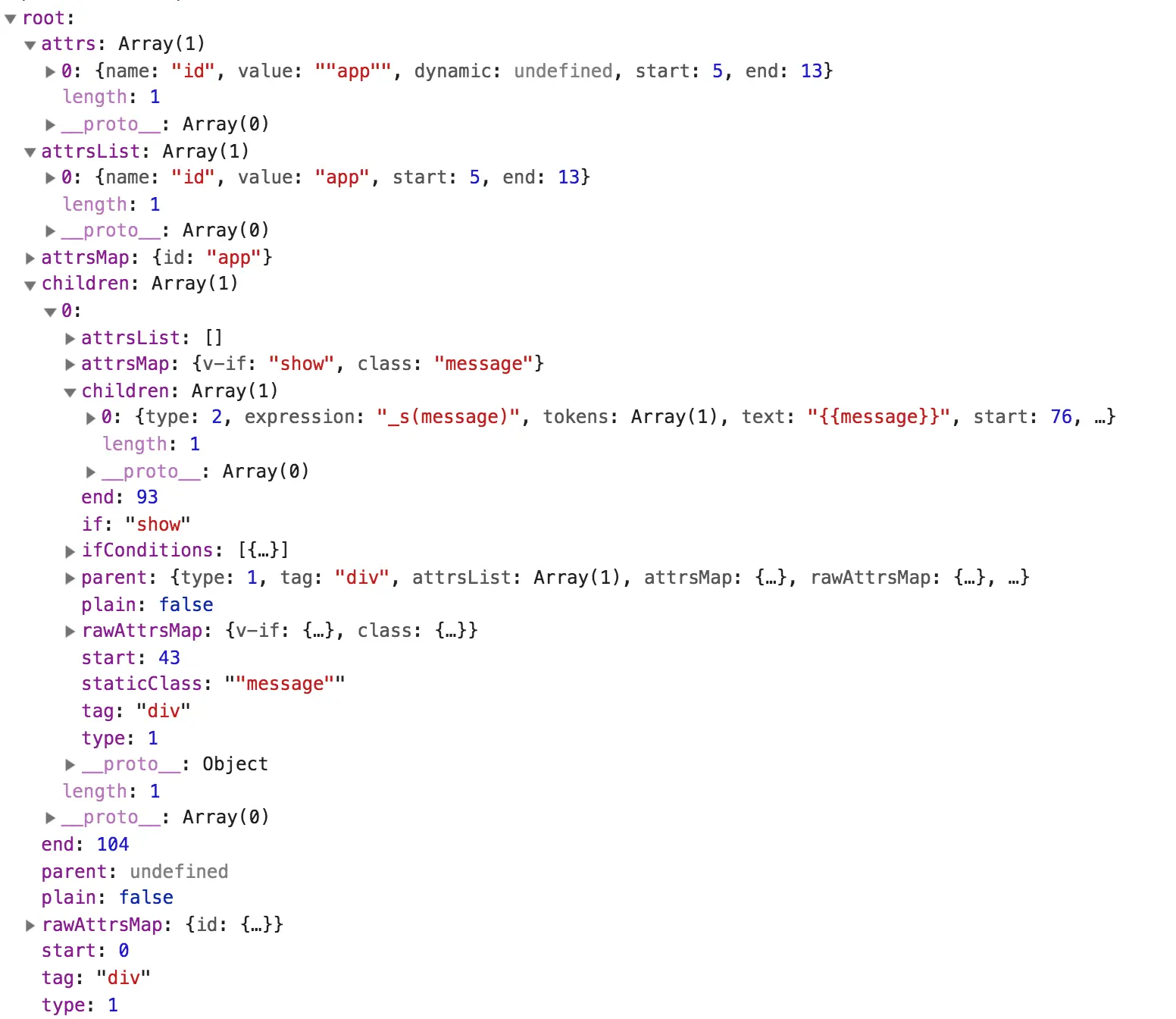 到这个结尾可以看一下现在返回的root也就是ast是什么样子,和预想中的基本一致。