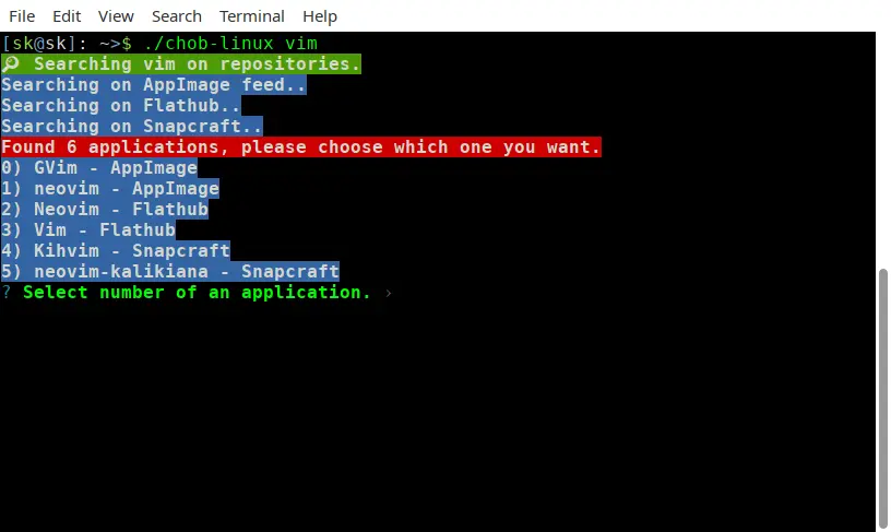 Chob 将在 AppImage、Flathub 和 Snapcraft 平台上搜索给定的应用(和相关应用)并显示结果。