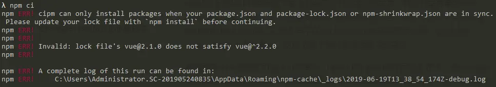 因此后续npm也推出了npm ci的指令来解决这一问题,npm ci和npm i的不同之处在于:当package-lock.json指定的依赖版本不在package.json指定的依赖版本范围内时,npm会报错并取消安装。