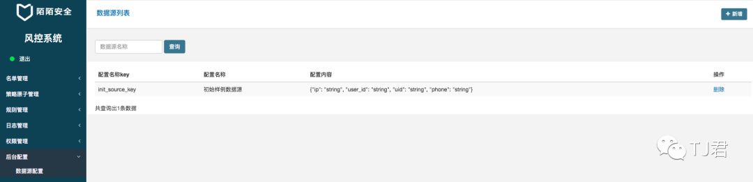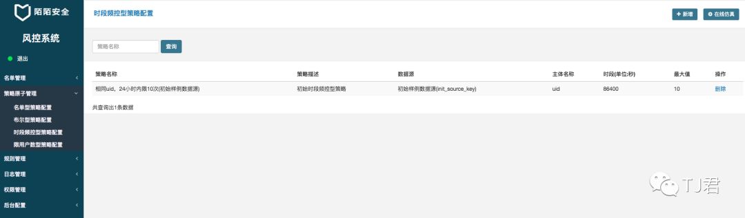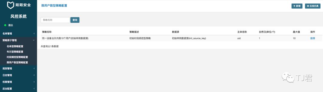 示例策略:同一设备一天内限制登录1000次 那么每次登陆就需要上报一条数据,系统会分类计数,并分类存储。 存储的名字叫啥?就是此处要配置的数据源。对于此策略,只需要配置数据源,命名为login_uid, 字段包含uid, uid类型是string。然后程序就能根据uid为维度计数,并自动计算指定时间窗口内是否超出指定阈值。