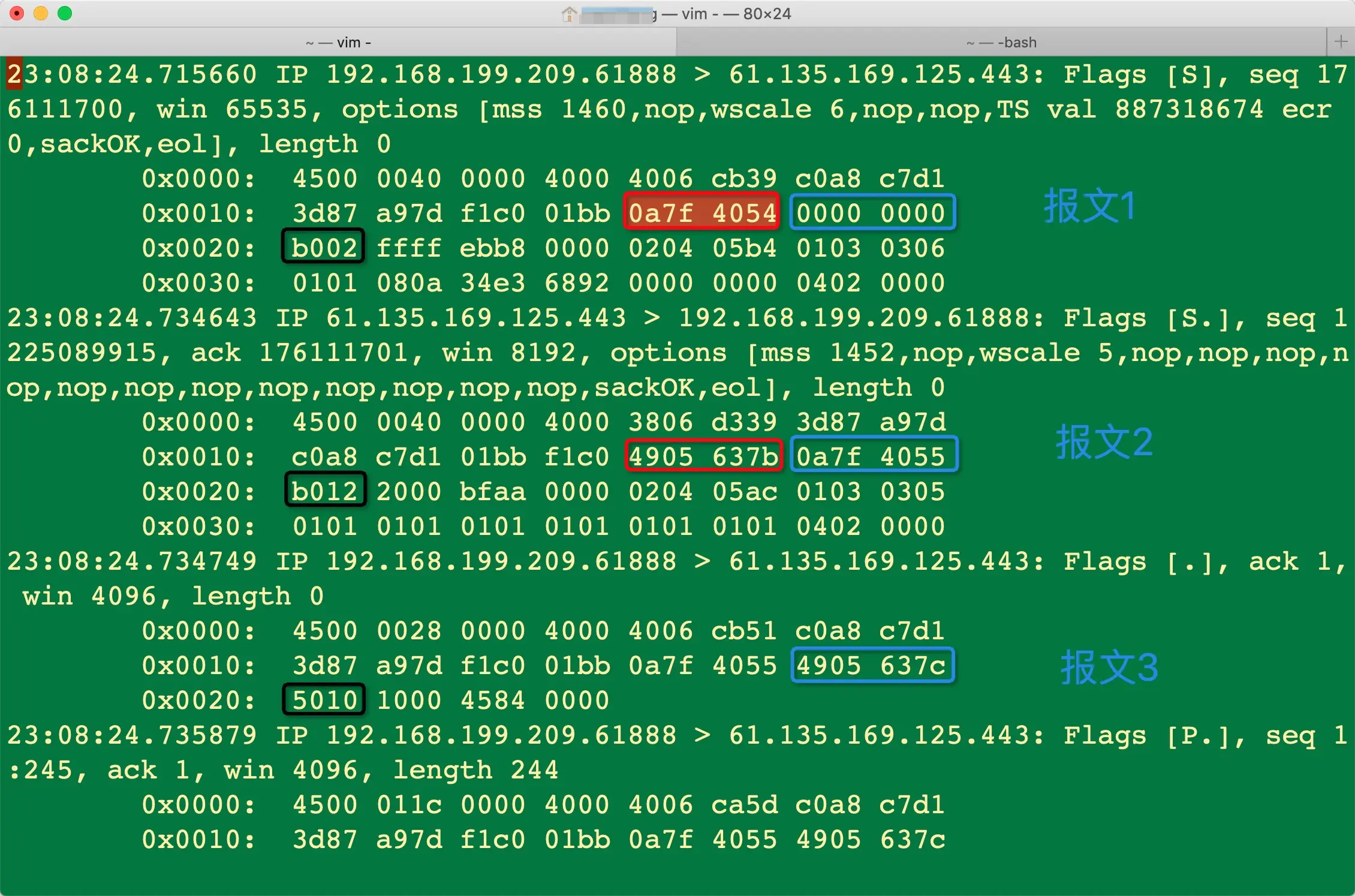 - 使用vim读取报文并分析。-x 以16进制形式展示