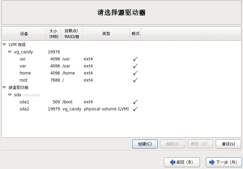 除了/boot分区外,其余都为LVM 模式的扩展逻辑分区