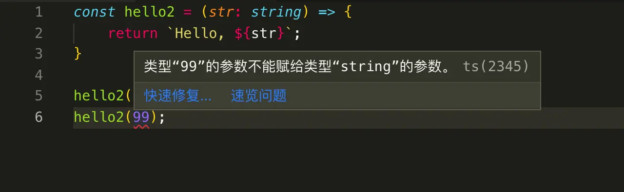 这里,给参数 string 添加了 : string 类型注解,指定变量的类型为字符串,: 的前后有没有空格都可以。你会发现编辑器中会提示错误
