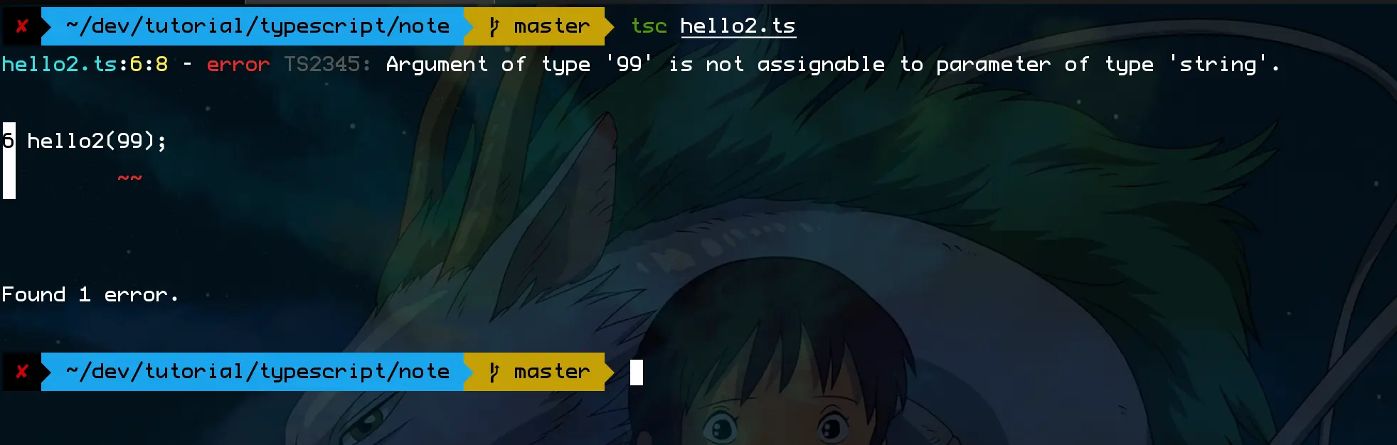然后执行 tsc hello2.ts,编译也会出错。说 99 不能作为类型需要是字符串的参数,这是我希望看到的,这波操作 666。但是 hello2.js 还是编译出来了生成 js 文件了(尽管 hello2.ts 书写有问题,但是前面说过我是有包容心的)