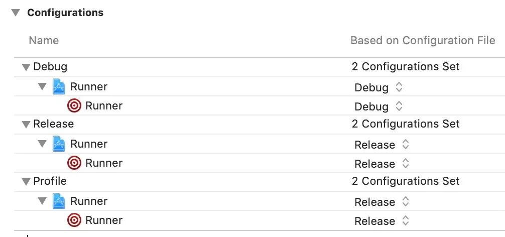 Flutter 的xcconfig 包含三个文件,Debug.xcconfig 、Release.xcconfig 、Generated.xcconfig ,需要将这些文件配置在下面的位置,并且按照不同环境配置不同的文件。