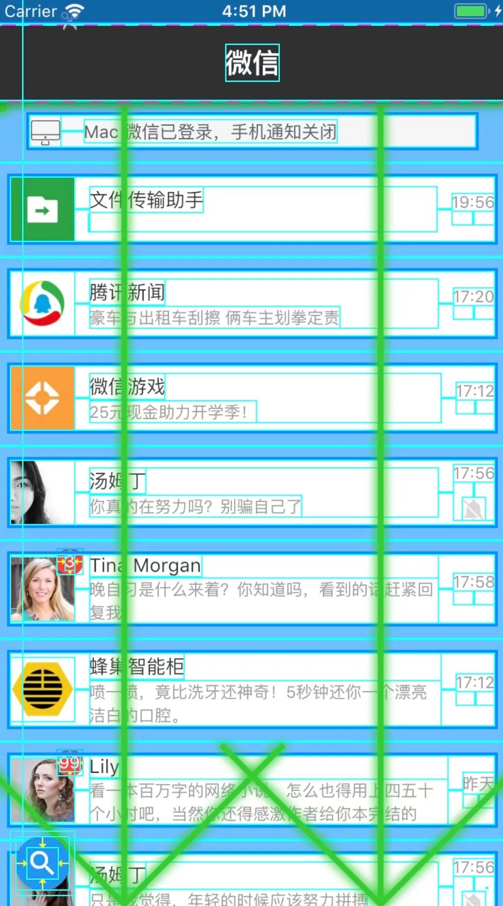 点击 Debug Paint可以让每个控件都高亮,通过这个模式可以看到 ListView的滑动方向,以及每个控件的大小及控件之间的距离。