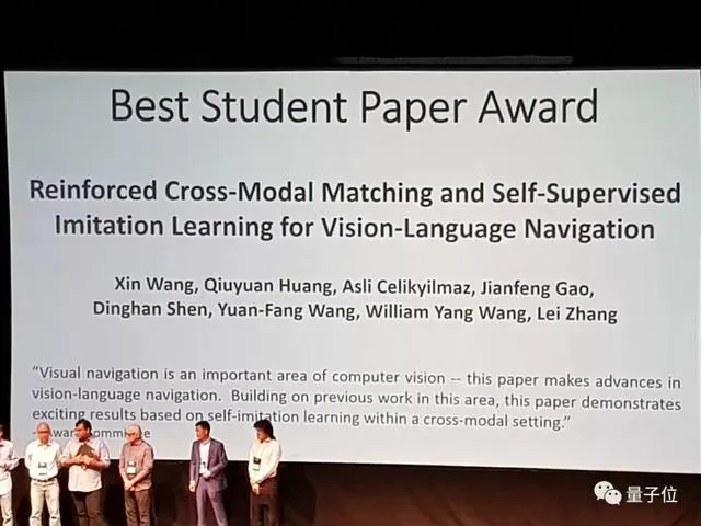 今年的最佳学生论文颁给了来自加州大学圣巴巴拉分校(UCSB)王鑫的论文《视觉语言导航中的强化跨模态匹配和自监督模仿学习》,用自然语言为AI智能体指路。