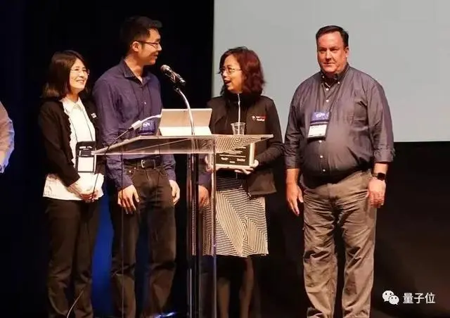 △李飞飞和她的学生李佳、李凯上台领奖。图片来自雷锋网