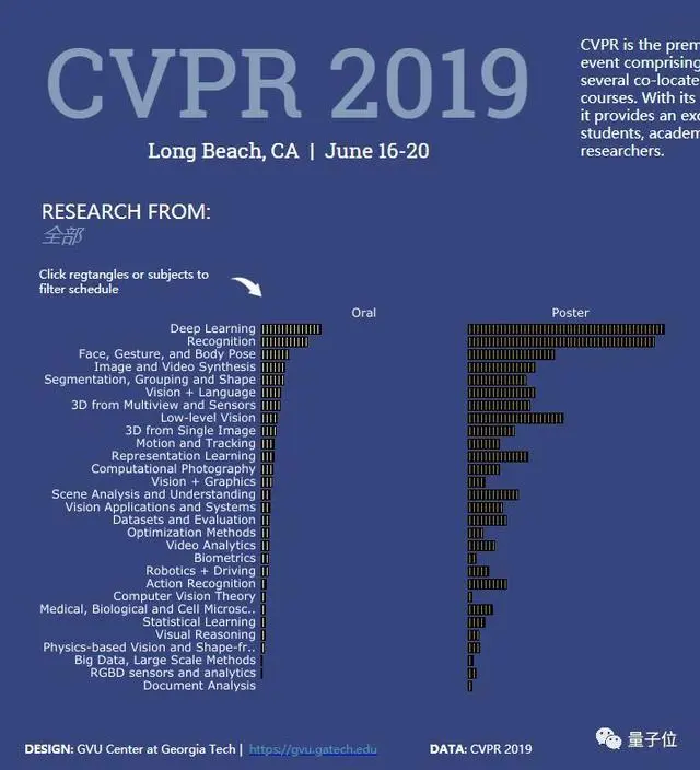 CVPR 2019的官网上,也上线了一个可视化工具。可以根据论文机构对论文进行筛选,从中可以看出,当前学者们的研究,也大多集中在深度学习、识别、以及面部姿态等主题。