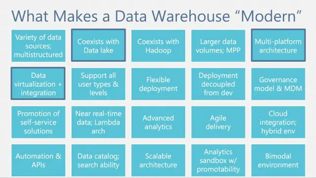 在图3 Melissa Coates的总结中我们可以得出,现代数仓之所以“现代”,是因为它有多平台架构、数据虚拟化、数据的近实时分析、敏捷交付方式等等一系列特性。