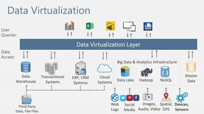 数据虚拟化,是指对于用户或用户程序而言,面对的是统一的交互方式和查询语言,而无需关注数据实际所在的物理库和方言及交互方式(异构系统/异构查询语言)的一种技术。用户的使用体验是面对一个单一数据库进行操作,但其实这是一个虚拟化的数据库,数据本身并不存放于虚拟数据库中。